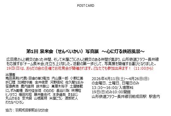 「泉米会」とは、鉄道写真家 広田泉さん、米屋こうじさんとの山形での出会いから誕生した写真仲間たちの会。会の名前は、お二人のお名前から一文字ずついただきました。企画・運営については「羽前成田駅前 おらだの会」のみなさまにご協力いただいております。