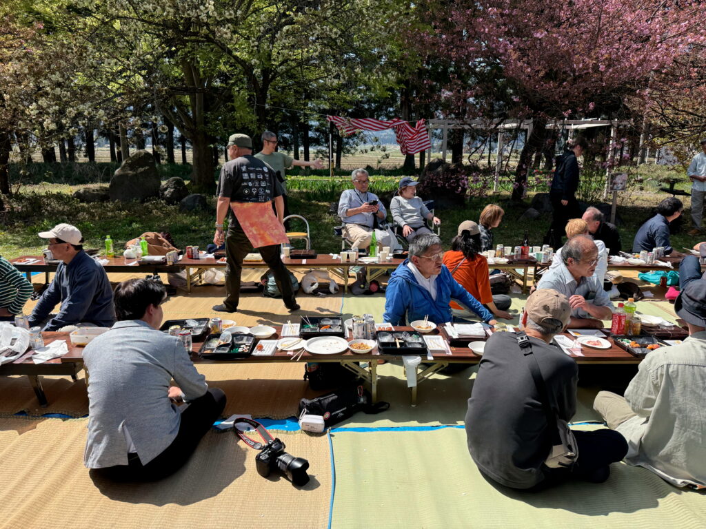 お花見会は駅前の広場にゴザを敷いてテーブルを出して酒盛りをするという昔ながらのスタイル。おらだの会のみなさまはもちろん、観光ツアーの方、けん玉関係の方、泉米会といろんな人たちが集結しての楽しい会でした。